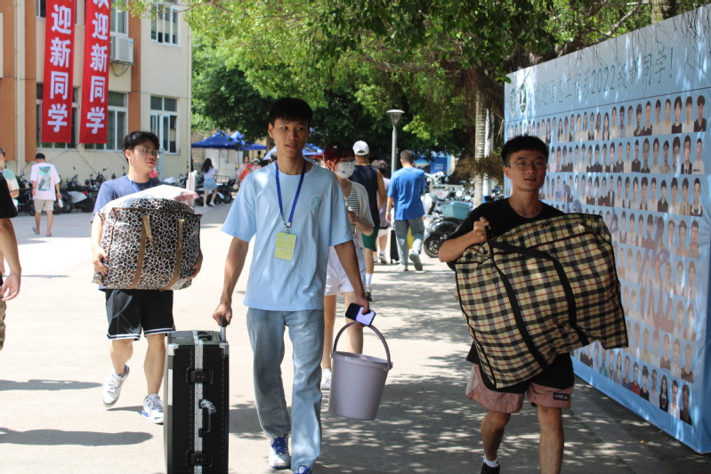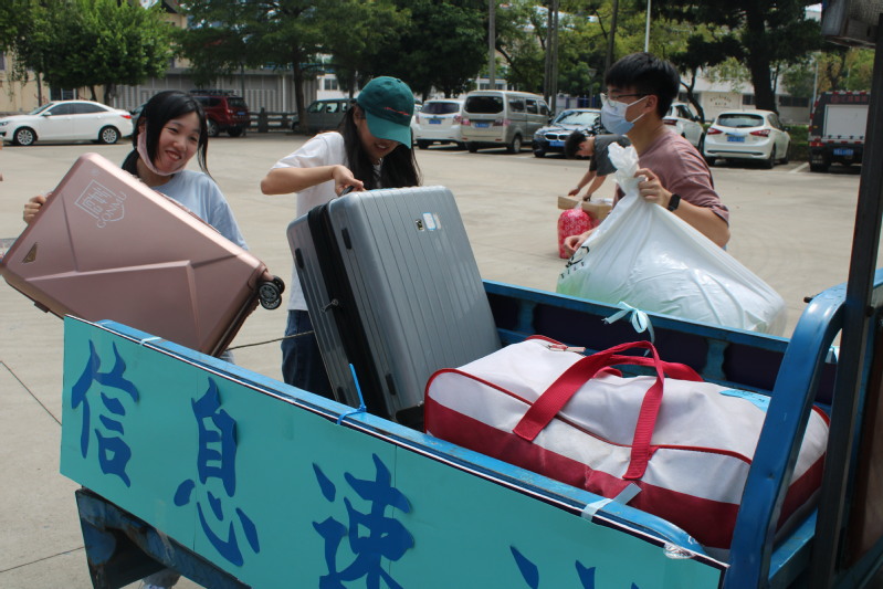 新生抵达校园后,“信息蓝”们兵分两路,一路人将新生带到大本营前进行签到交接后,指引新生在照片墙前打卡拍照,另一路驾驶“信息速递”三轮车,将新生的大件行李运送至宿舍楼。