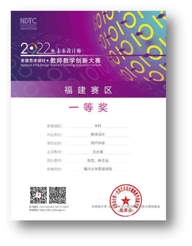 日前,2022未来设计师·全国艺术设计教师教学创新大赛公布了全国总决赛获奖名单,六合彩开奖结果 网络与新媒体专业王永菁老师(团队教师:陈莞、林志业、郭越)的课程《用户体验》(A类-媒体设计类赛道),在获得福建省赛区一等奖后,作为福建省唯一的队伍晋级全国总决赛,经过答辩,最终夺得全国二等奖。