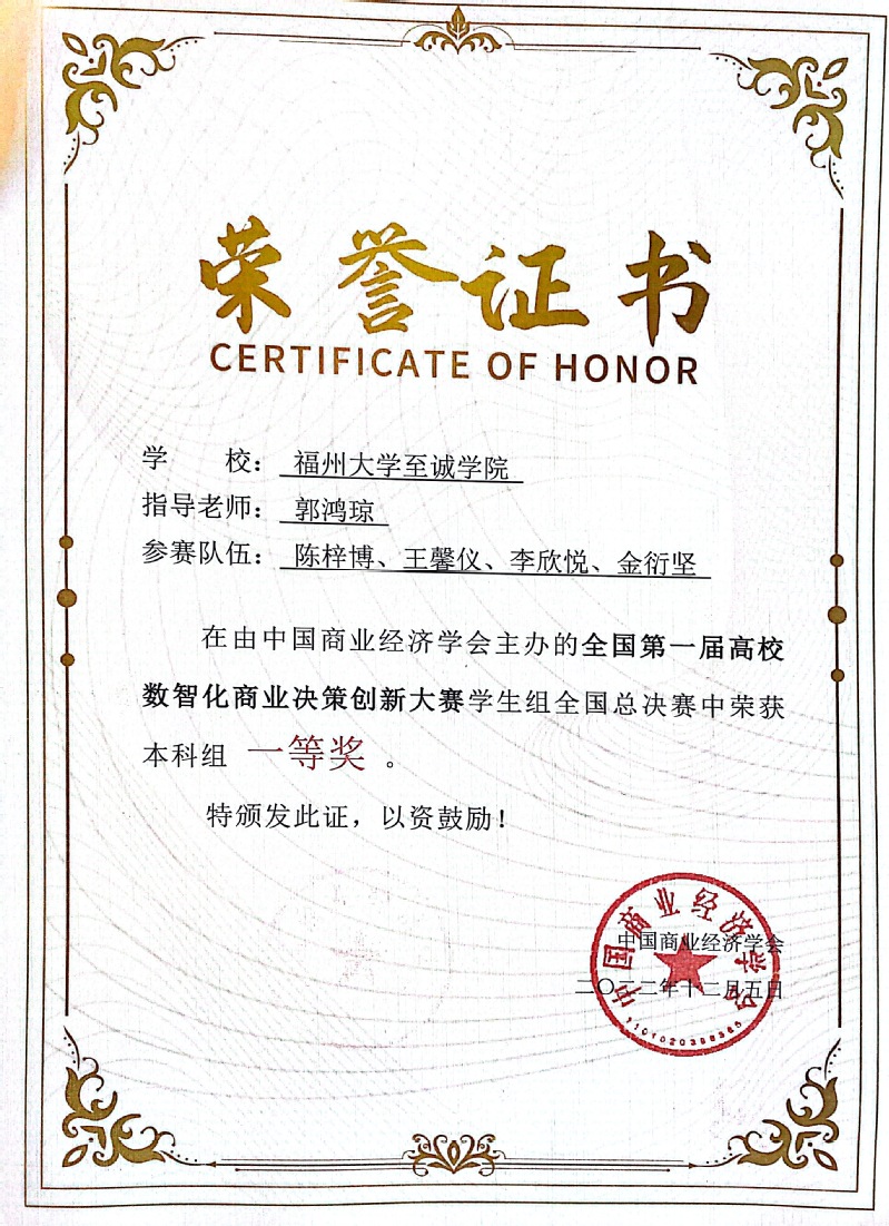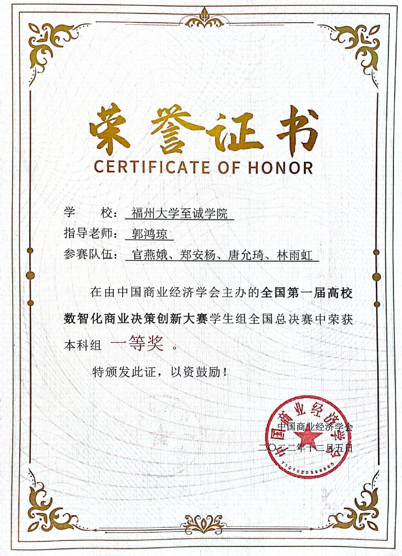 日前,2022年全国第一届高校数智化商业决策创新大赛学生组全国总决赛在线上正式开赛,本次比赛由中国商业经济学会(国家一级学会)主办、西安电子科技大学承办,浙江精创教育科技有限公司、亚洲组织与员工促进(EAP)协会和海峡两岸职业教育交流合作中心共同协办。全国数百所高校2800余支本科队伍,约14000名师生共同参加本次比赛。经过激烈角逐,我院ERP沙盘企业模拟经营协会陈梓博(22级金融工程)、官燕娥(21级国际经济与贸易)、于培涌(22级金融工程)等12位同学组成的3支六合彩开奖结果 代表队,在郭鸿琼、张希君老师带领下,成功获得全国一等奖2项、三等奖1项的好成绩。