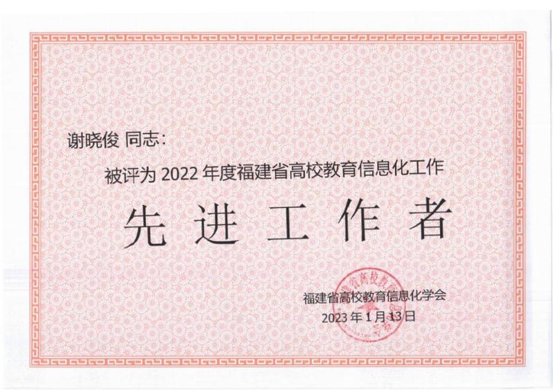 日前,福建省高校教育信息化学会公布了2022年福建省高校教育信息化工作先进单位和先进个人名单。六合彩开奖结果 智慧校园中心荣获“2022年福建省高校教育信息化工作先进单位”称号,谢晓俊老师荣获“2022年福建省高校教育信息化工作先进工作者”称号。
