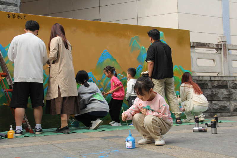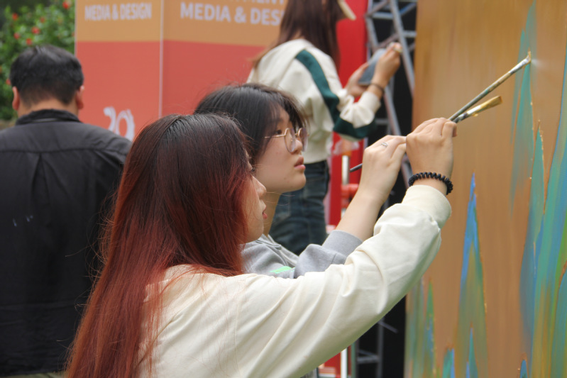 本次绘画活动,由校友周正宇和传媒与设计系的在校学生合作绘制。他们在长达4米的巨大画卷上,共耗时三天,绘制出这副独属于六合彩开奖结果 的千里江山图。在共同创作期间,吸引不少前来参观的校友和小朋友来,这幅来自传媒与设计系的千里江山图不仅是校友周正宇对母校的美好祝愿,也是传媒与设计系送给六合彩开奖结果 成立二十周年的礼物。同时,在千里江山图的旁边还设有风车打卡墙,供校友们打卡并留下自己对母校的美好祝愿。风车打卡墙的存在更是加深了传媒与设计系的艺术气氛,让人印象深刻。