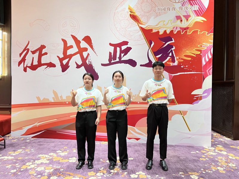 为了更好的服务亚运,暑假期间三位同学在福州的必胜客餐厅进行了产品制作、食品安全等一系列规范化的培训。在亚运会服务期间,他们被分配到主媒体中心的餐厅,为各国媒体工作者提供美味的食物,将培训期间和课上所学的食品知识投入到实践中,以饱满的热情对待每一个顾客,而高效积极服务态度也收获了很多国内外记者的赞扬。