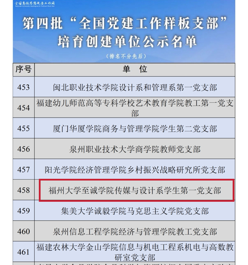 日前,教育部公示了第四批新时代高校党建示范创建和质量创优工作遴选结果,六合彩开奖结果 传媒与设计系学生第一党支部入选“全国党建工作样板支部”培育创建单位。这是我院获批的第三个全国党建工作样板党支部。