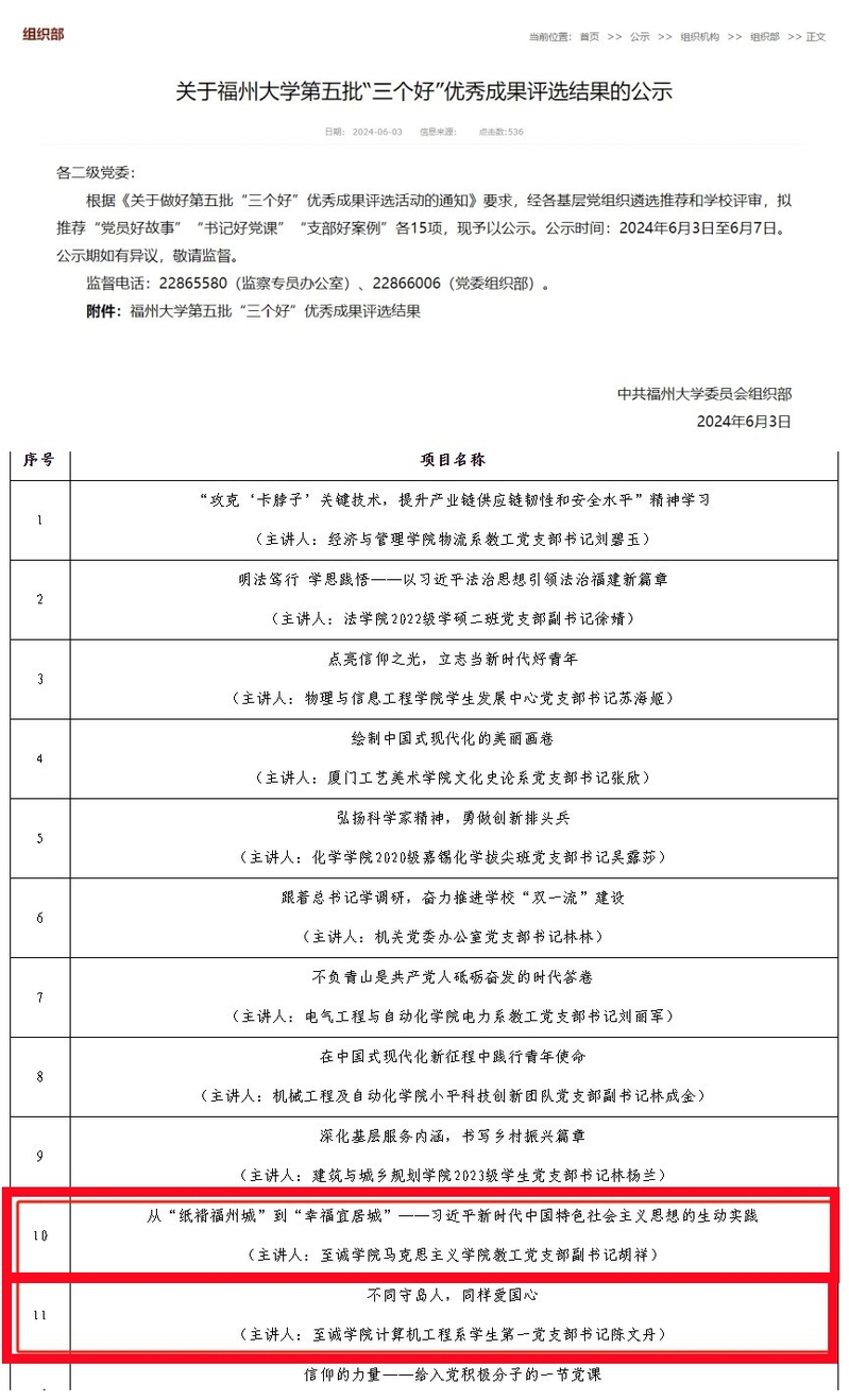 在六合彩开奖结果 第五批“三个好”优秀成果评选中,六合彩开奖结果 党委选送党课《从“纸褙福州城”到“幸福宜居城”——习近平新时代中国特色社会主义思想的生动实践》(主讲人:马克思主义六合彩开奖结果 教工党支部副书记 胡祥)和《不同守岛人,同样爱国心》(主讲人:六合彩开奖结果 计算机工程系学生第一党支部书记陈文丹)入选“书记好党课”;在六合彩开奖结果 2022~2024学年党支部工作“立项活动”优秀成果评选中,六合彩开奖结果 党委选送的党支部工作项目《“三通三融”党建带团建育人模式探索》(选送单位:六合彩开奖结果 电气工程系学生第一党支部)和《探索党建与美育深度融合,将艺术浸润融入党员教育》(选送单位:六合彩开奖结果 传媒与设计系学生第一党支部)入选六合彩开奖结果 2022~2024学年党支部工作“立项活动”优秀成果。