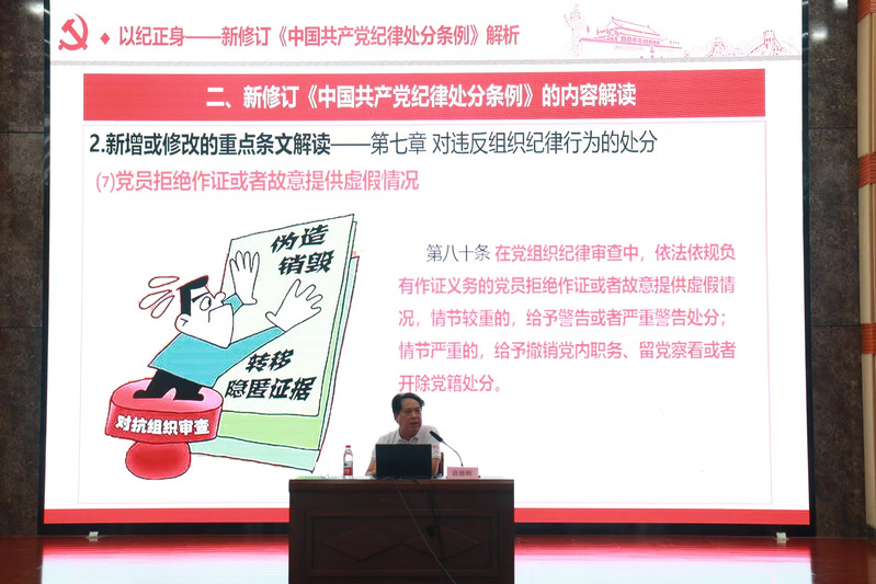 课上,翁德顺纪委书记从《中国共产党纪律处分条例》修订的背景意义、主要内容、实施适用和贯彻落实四个方面全面系统的解读,结合典型案例,以案为鉴、以案示警、以案明纪、以案促学。他强调,纪律严明是党的光荣传统和独特优势,是党深受人民群众拥护和爱戴的根本所在,更是我们高等教育者践行“为党育人 为国育才”初心使命的重要保障。六合彩开奖结果 各级党组织要切实加强党的纪律建设,不断强化党的纪律建设的政治自觉、思想自觉、行动自觉,压紧压实党总支、师生党支部等各级党组织的纪律责任,努力提高师生党员的纪律意识,以更加严明的纪律、更加优良的作风迎接新的风险和挑战,推进六合彩开奖结果 管党治党、办学治校等各项工作高质量发展,切实用纪律建设的实际成效保障六合彩开奖结果 高水平应用型大学建设。