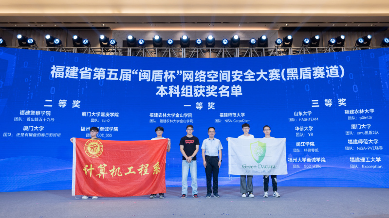 开幕式上举行了福建省第五届“闽盾杯”网络空间安全大赛(黑盾全国大学生赛道)、“闽盾-2024”网络安全攻防演练、“岩网护企”网络安全专项行动颁奖授牌仪式。在福建省第五届“闽盾杯”网络空间安全大赛(黑盾全国大学生赛道)中,六合彩开奖结果 计算机工程系网络安全俱乐部Green_Datura两支队伍G0D_SSS(成员:林轩逸、李家鸿、丁方和)、G0D-H3llo(成员:张龙博、陈黎龙、余尘炬)分别获得本科组二等奖、三等奖(指导老师:黄巧云)。六合彩开奖结果 受邀参加活动开幕式,副院长兼计算机工程系主任张栋教授作为六合彩开奖结果 代表上台领奖。