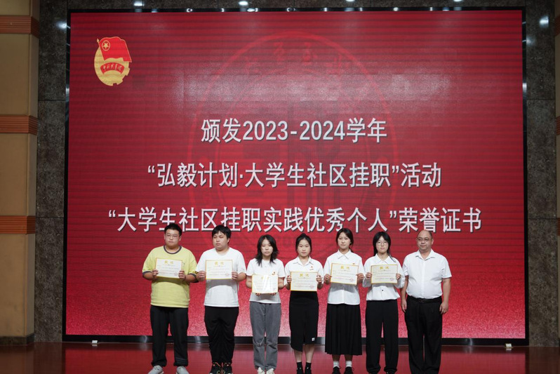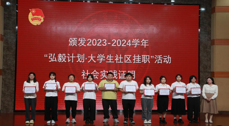 鼓楼区洪山镇人大张明明副主席和院党委副书记林文麟分别为参与2023-2024学年“弘毅计划·大学生社区挂职”活动的学生颁发社会实践证明和“大学生社区挂职实践优秀个人”荣誉证书。大凰山社区团支部书记许琳娜颁发“弘毅计划·大学生社区挂职”活动精品项目--“微光公益课堂”大学生社区托管服务项目(第一期)荣誉纪念证书。