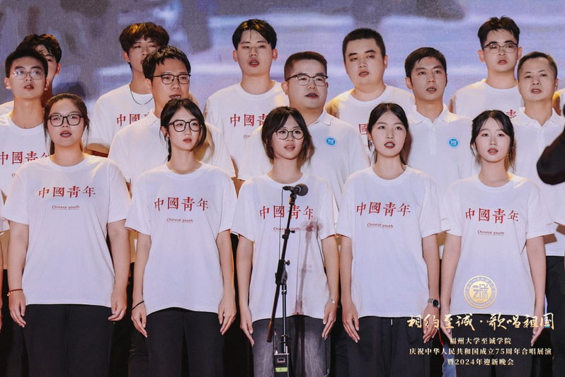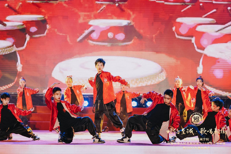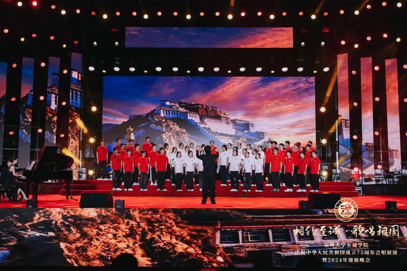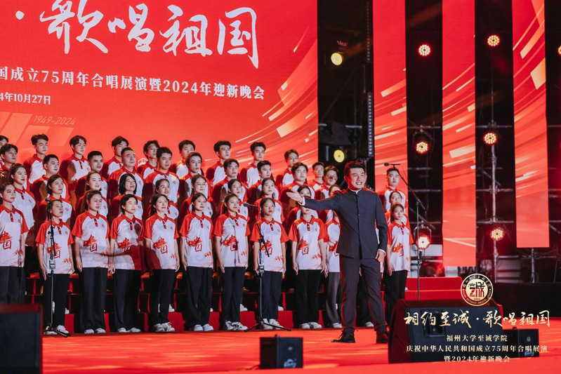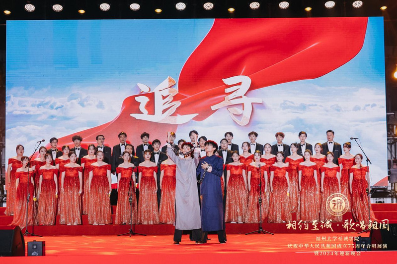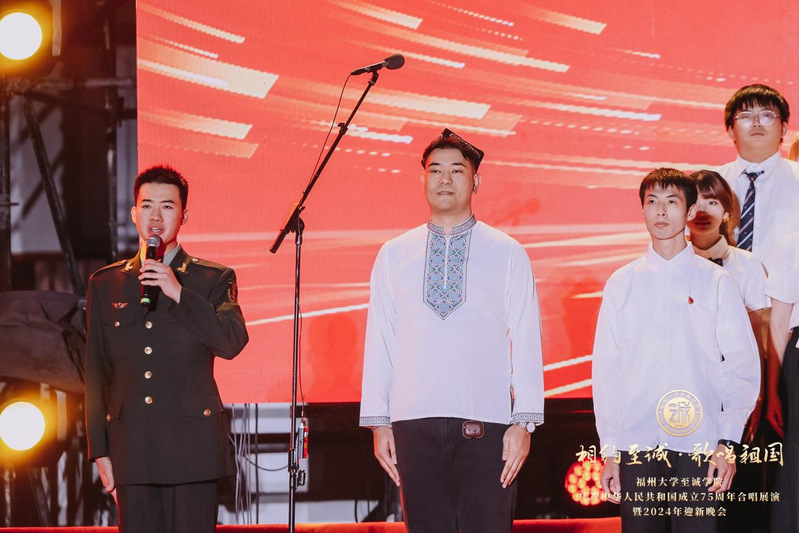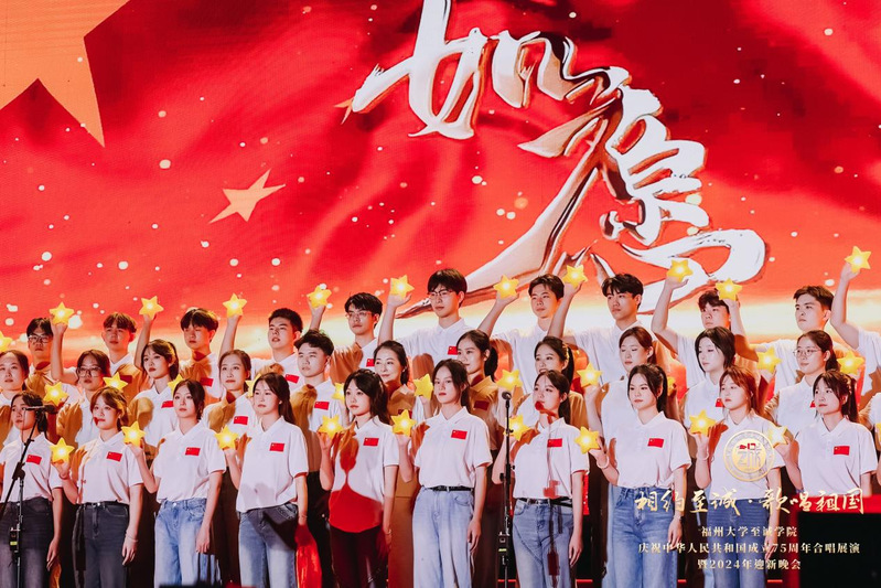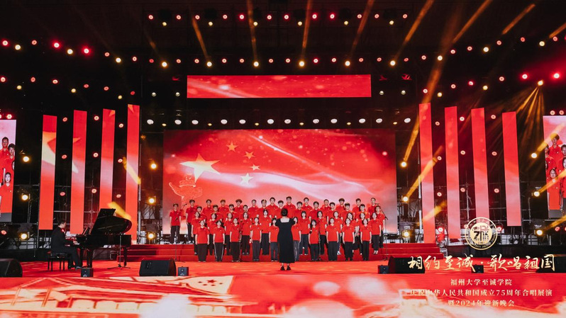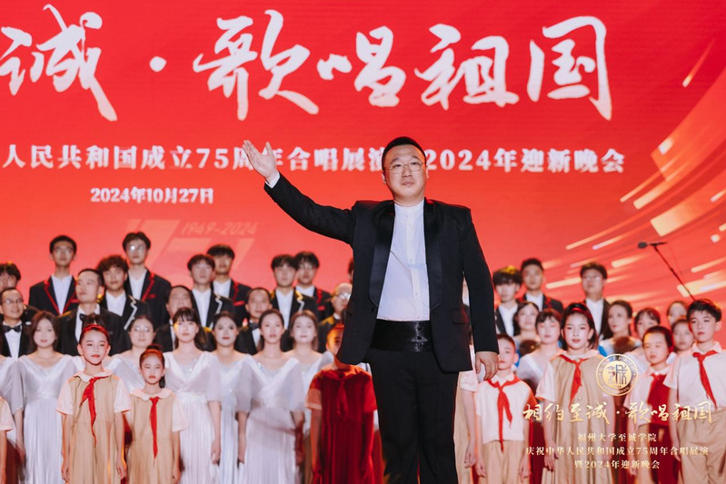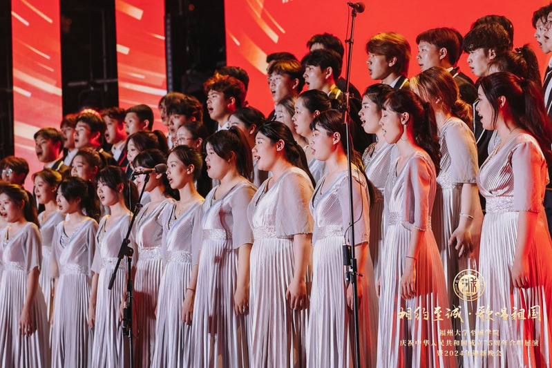 最后,在指挥者潘超的带领下,师生同台共唱《今天是你的生日,中国》,以最真挚的歌声献礼新中国七十五周年华诞。