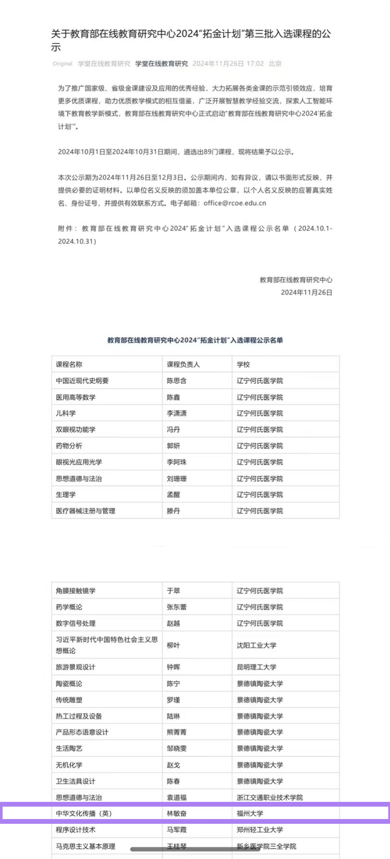 日前,教育部在线教育研究中心2024年“拓金计划”第三批示范课程入选名单公示结束,共遴选出89门课程。六合彩开奖结果 外国语系林敏奋老师及其教学团队(陈娟、毛烨老师)的省级一流课程“中国文化传播(英)”成功入选。这是六合彩开奖结果 课程首次跻身“拓金计划”名单,是六合彩开奖结果 AI赋能教学改革课程建设的一项新成果,不仅展示了六合彩开奖结果 在教学内容和方法上的创新,也体现了六合彩开奖结果 在AI赋能教学改革方面的积极探索和实践。
