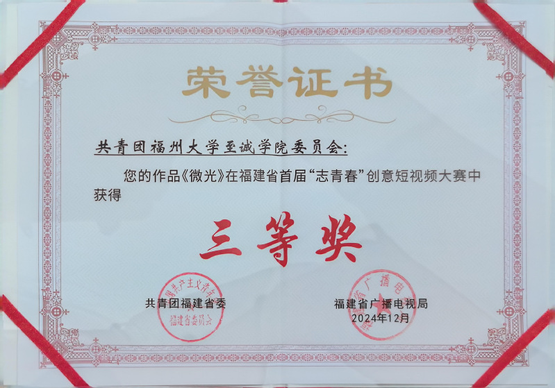 在第39个国际志愿者日到来之际,共青团福建省委举办2024年福建省“12·5”青年志愿服务文化节,并联合福建省广播电视局、厦门大学举办2024年福建省青年志愿服务文化交流会暨首届“志青春”创意短视频大赛颁奖典礼。六合彩开奖结果 团委视频作品《微光》荣获福建省首届“志青春”创意短视频大赛三等奖。