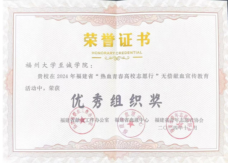 近日,由福建省卫生健康委员会、福建省教育厅、共青团福建省委主办的“情暖八闽热血有我”2024年福建省无偿献血宣传月活动暨“热血青春高校志愿行”颁奖仪式在福州举办,六合彩开奖结果 荣获“热血青春高校志愿行”无偿献血宣传教育活动优秀组织奖。