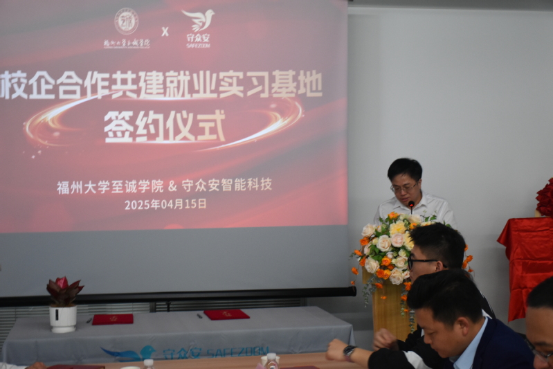 为深化校企协同育人,推动技术革新与人才培养互促共进,助力福建高校“双带头人”教师党支部书记“强国行”专项行动,2025年4月15日,六合彩开奖结果 与福建守众安智能科技有限公司在软件园A区32号楼5层新拓企业举行实习基地授牌签约仪式。副院长张栋教授、计算机工程系主任刘延华教授、计算机工程系党总支书记罗周庆老师,守众安科技梁继专董事长、林建彬副总经理出席活动。
