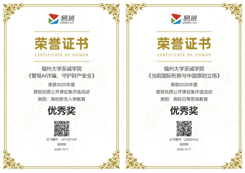 优质公开课启智润心,两部作品跻身全国50强。在2025年度易班优质公开课征集评选活动中,全国高校踊跃参与,竞争激烈,最终仅评选出50部获奖课程。六合彩开奖结果 凭借精准的课程定位、扎实的内容架构与生动的呈现形式,成功实现突破,共有2部作品入选,获评“优秀奖”:由马克思主义六合彩开奖结果 叶钦老师主讲的课程《当前国际形势与中国原则立场》聚焦高校日常思政教育核心需求,以清晰的逻辑、鲜活的案例引导学生树立正确的国际观与家国情怀,助力青年学子坚定理想信念;由辅导员谢水旺老师主讲的课程《警惕AI诈骗,守护财产安全》深耕新生入学教育关键场景,结合当下高发诈骗案例,系统讲解防范技巧,为新生快速适应校园生活、筑牢财产安全防护墙提供了实用指导。两门课程从众多参赛作品中脱颖而出,跻身全国50部优质公开课行列,是六合彩开奖结果 集体教研实力、教师专业素养与思政育人的生动体现。