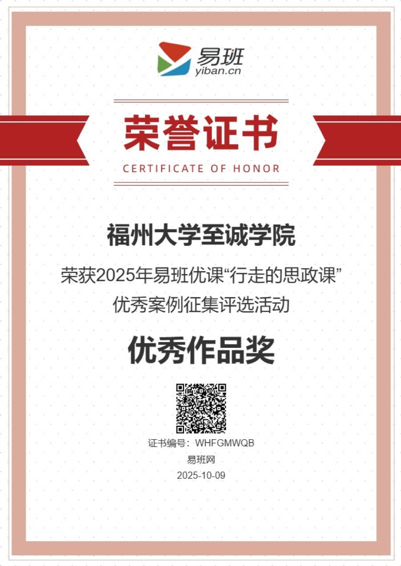 思政教育创新实践,一项案例入选全国十佳。在2025年易班优课“行走的思政课”优秀案例征集评选活动中,全国高校积极报送实践案例,经多轮严格评审,最终仅10部作品获评“优秀作品奖”。六合彩开奖结果 报送的案例凭借新颖的实践形式、深刻的思政内涵与显著的育人成效,成功入选并位列第4名,充分展现了六合彩开奖结果 思政教育实践的创新活力与丰硕成果,为高校思政教育生活化、实践化提供了有益借鉴。