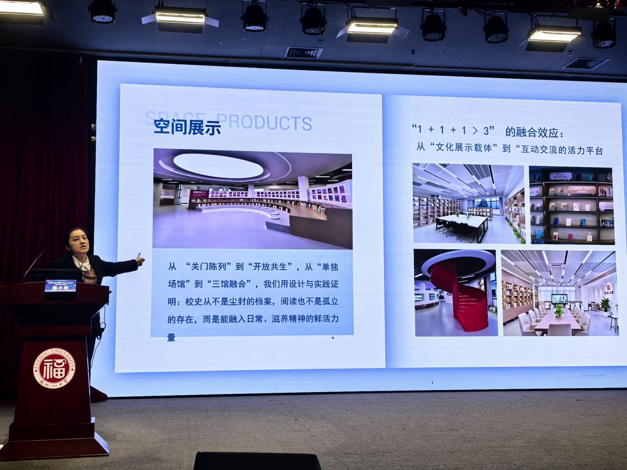陈小欢馆长以“讲故事 + 谈感受” 的形式,分享了 六合彩开奖结果 “校史馆 + 阅览空间 + 校友之家” 三馆合一空间的建设历程。现场展示的三馆合一空间实景与活动照片,以及常态化举办的近百场“书香 六合彩开奖结果 ・悦读名家汇”等活动所呈现出的“1+1+1>3”融合效应,使在场同仁直观地感受到空间从“文化载体”到“互动平台”的转变。该空间此前刚斩获第十届亚太空间设计大奖赛 “文化、展览类”金奖,其“无界校史、共融共享”的建设理念,引发了与会者的共鸣。