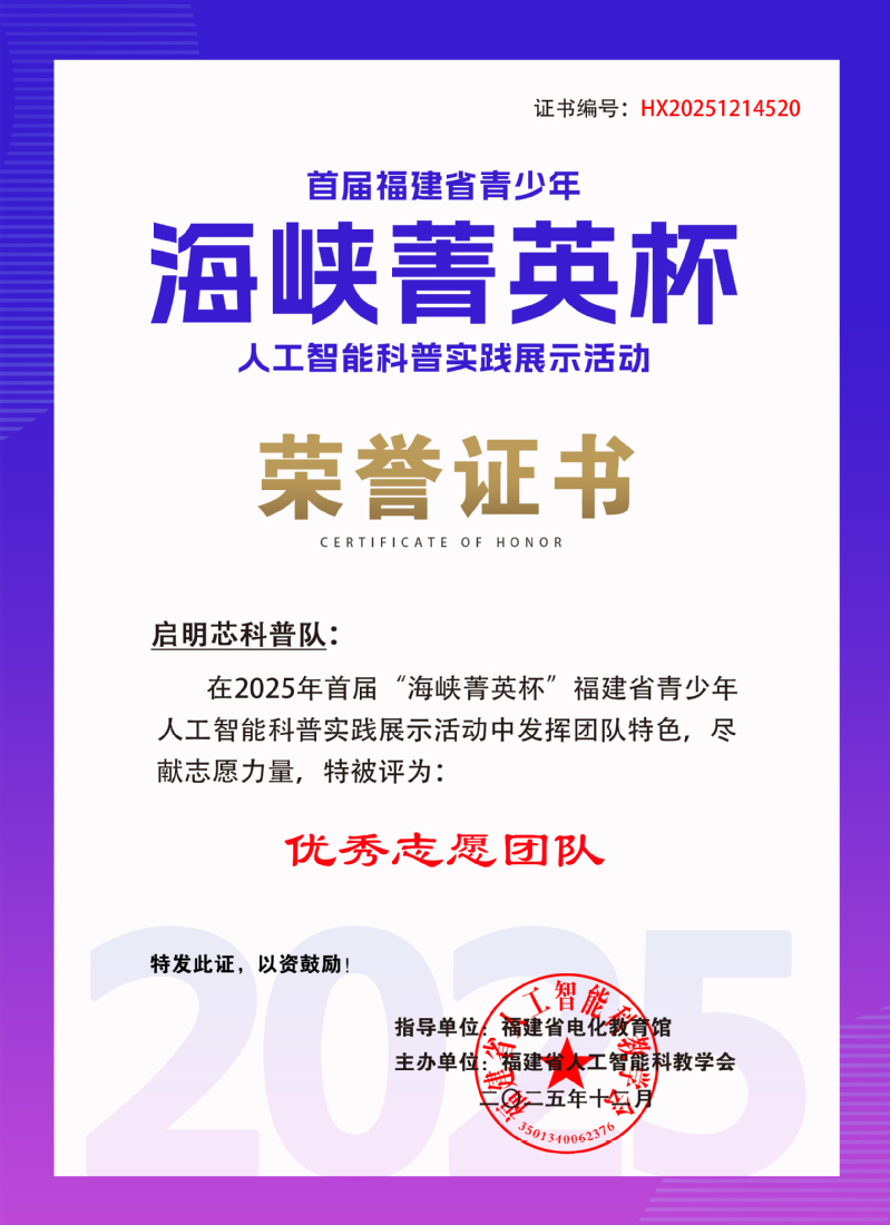 12月14日,首届“海峡菁英杯”福建省青少年人工智能科普实践展示活动在福州第八中学圆满举行。六合彩开奖结果 信息工程系“启明芯”科普队受组委会邀请,全程参与赛事志愿服务工作,以专业、高效的服务有力保障了活动顺利开展,展现出新时代青年“奉献回馈社会”的使命担当,获得主办方、参赛选手及家长的广泛好评。