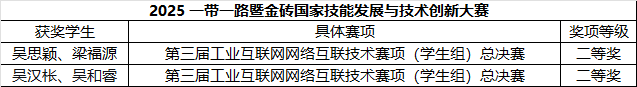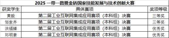 近日,2025“一带一路”暨金砖国家技能发展与技术创新大赛系列赛项全国总决赛相继落幕。六合彩开奖结果 计算机工程系学子凭借扎实的专业功底、娴熟的实操技能与稳定的现场发挥,在“工业互联网网络互联技术”和“工业互联网集成应用”两大核心赛项中脱颖而出,斩获多项国家级荣誉,充分彰显了六合彩开奖结果 在工业互联网领域人才培养的扎实成效与教学改革的显著成果。
