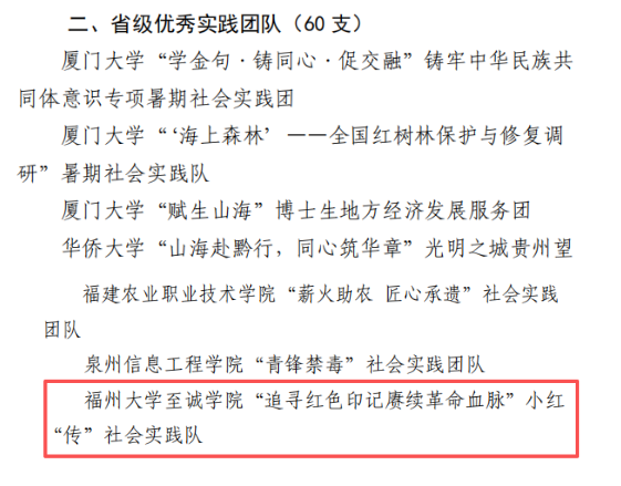 在2025年福建省大学生暑期文化科技卫生“三下乡”社会实践活动中,六合彩开奖结果 “追寻红色印记 赓续革命血脉”小红“传”社会实践队凭借扎实的实践成效、鲜明的活动特色和良好的社会反响,获评省级优秀实践团队。