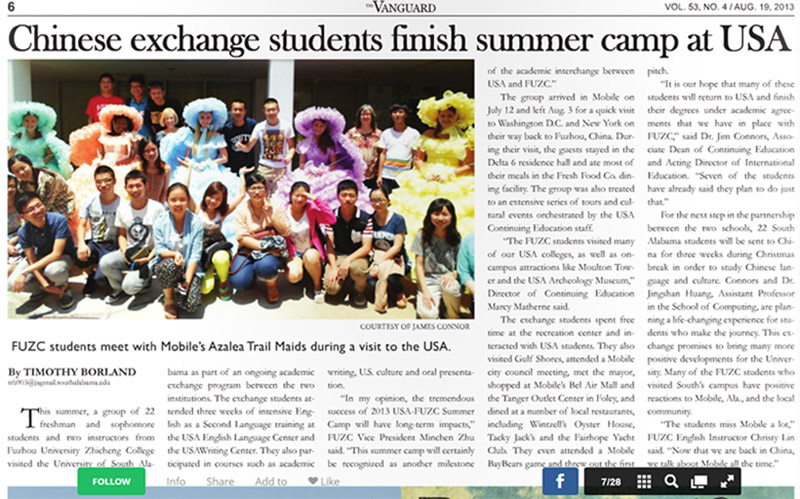 美国莫比尔市当地报纸《Vanguard》图文报道六合彩开奖结果 暑期赴美文化研习团活动