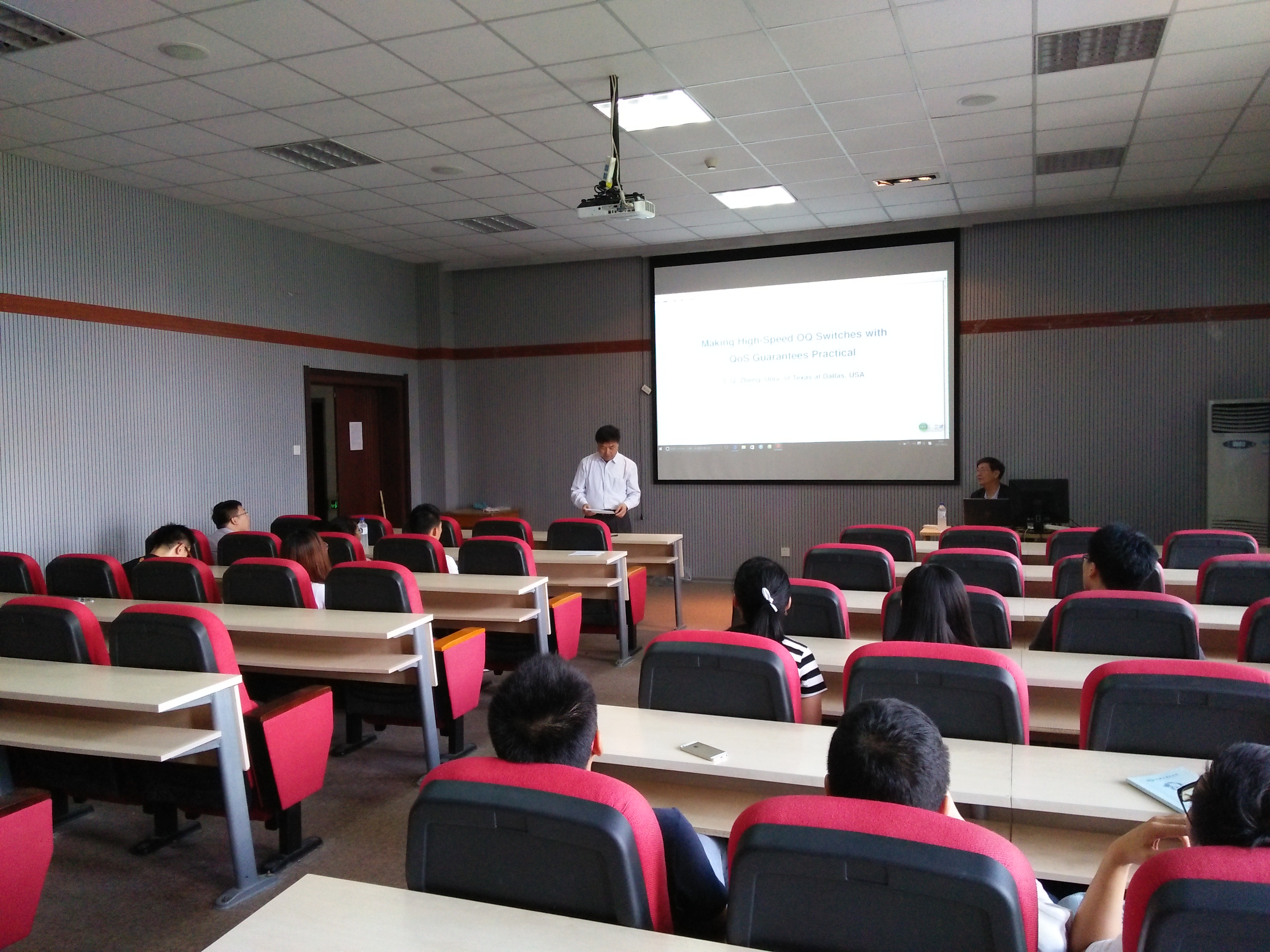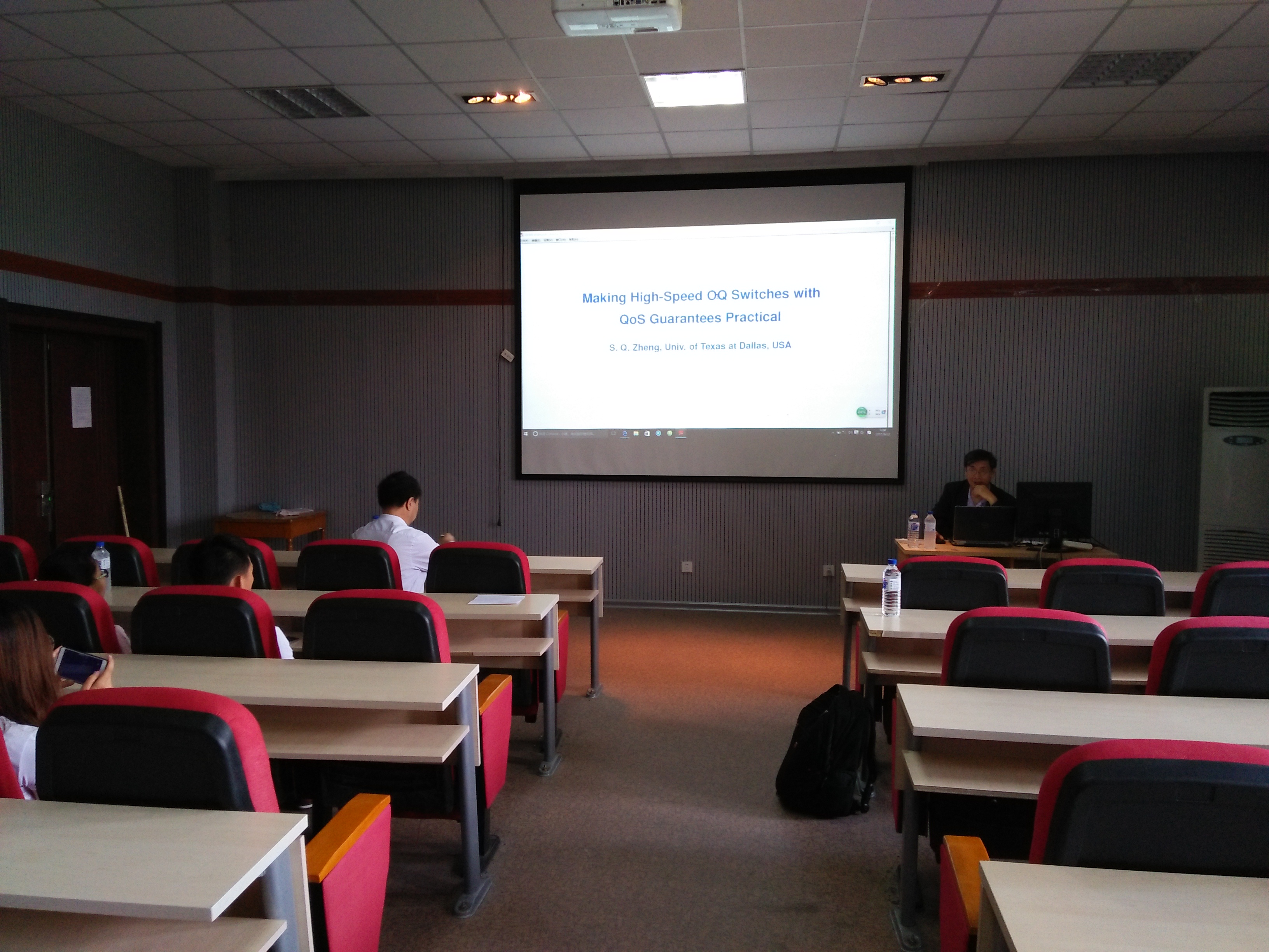 做了题为“Output-queued switch with performance guarantees”的学术报告。郑斯清教授是美国德州大学达拉斯分校终身教授,吉林大学唐敖庆讲座教授,曾经担任过Bononza、Alcatel等多家公司顾问、多个国际著名期刊的特约主编和IEEE并行和分布式系统学报编委。在IEEE Transactions on Computers,IEEE Transactions on Communications,IEEE Transactions on Parallel and Distributed System, IEEE Infocom等国际权威期刊和会议上发表了260多篇高水平学术论文,著书8部,专利16项,承担了美国自然科学基金项目等20余项。