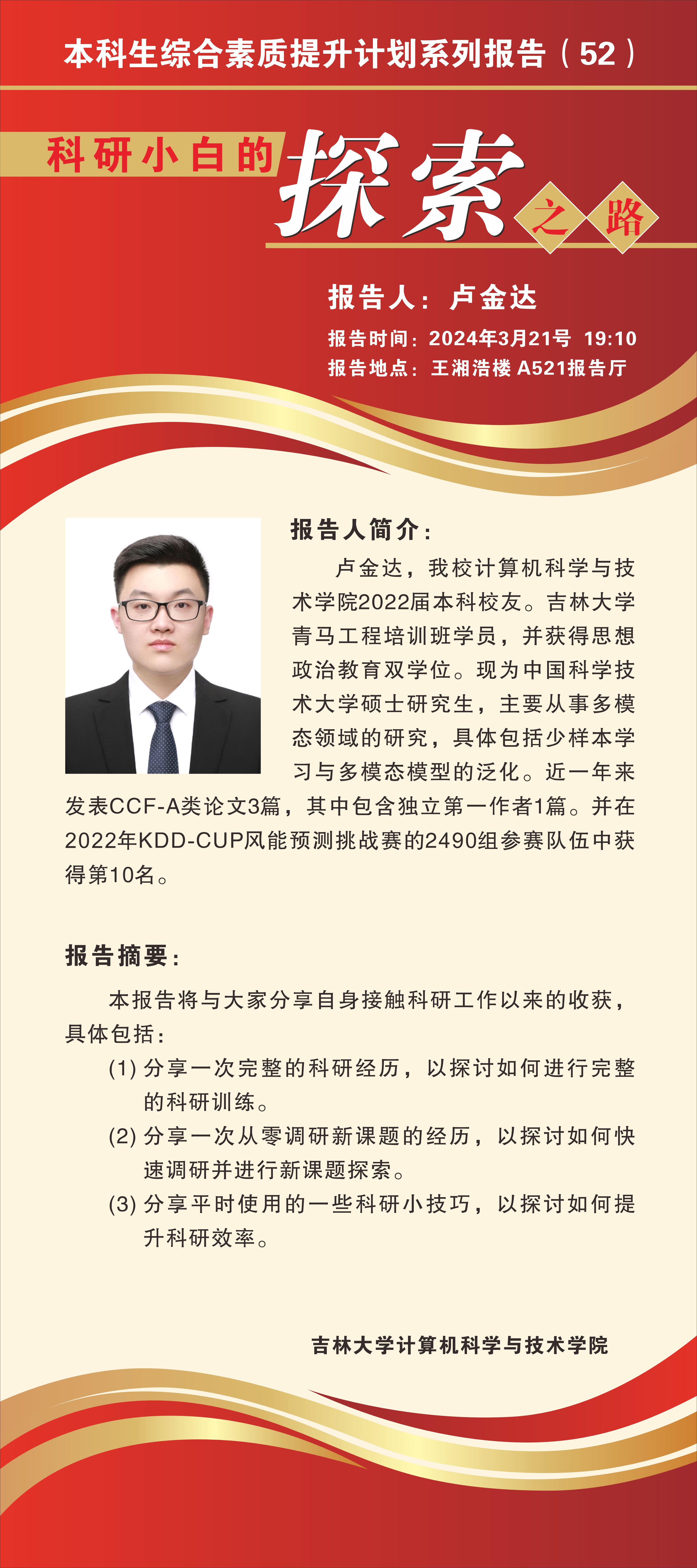 2022届本科校友。吉林大学青马工程培训班学员,并获得思想政治教育双学位。现为中国科学技术大学硕士研究生,主要从事多模态领域的研究,具体包括少样本学习与多模态模型的泛化。近一年来发表CCF-A类论文3篇,其中包含独立第一作者1篇。并在2022年KDD-CUP风能预测挑战赛的2490组参赛队伍中获得第10名。