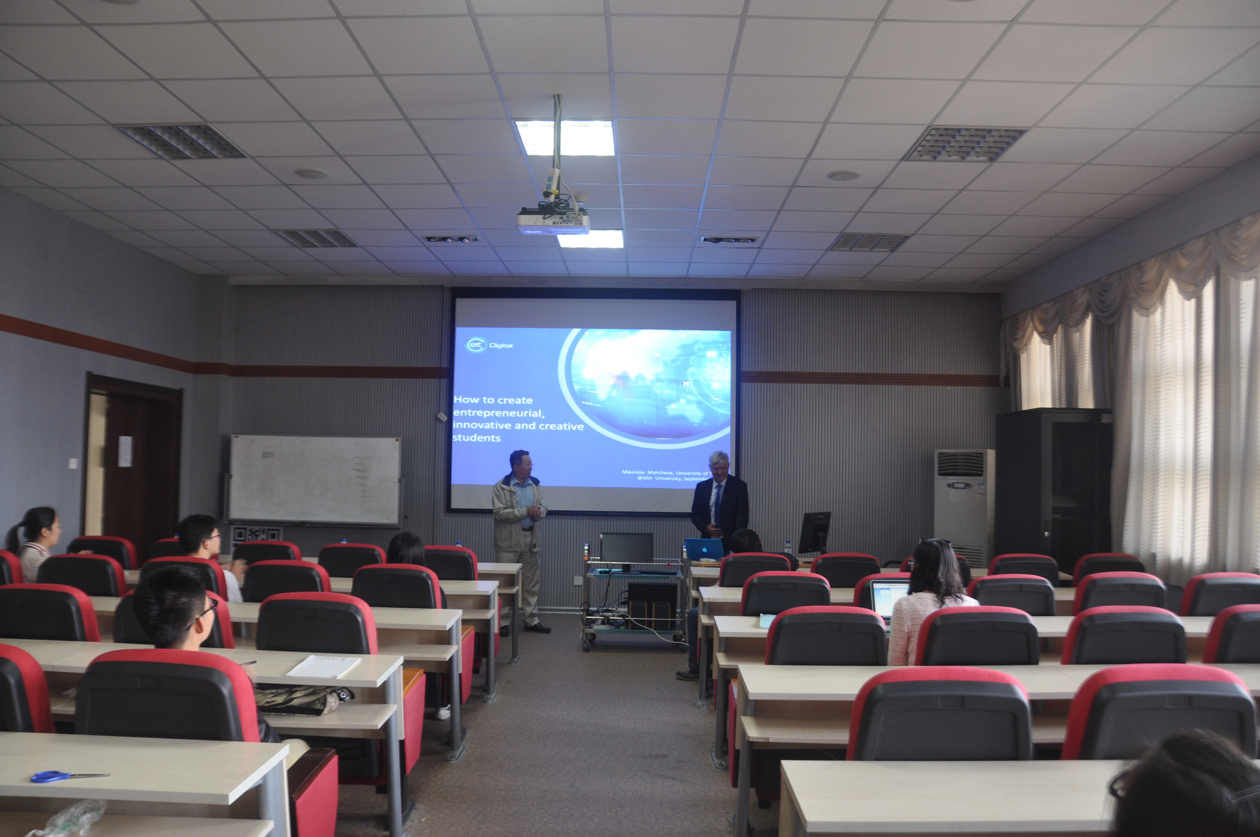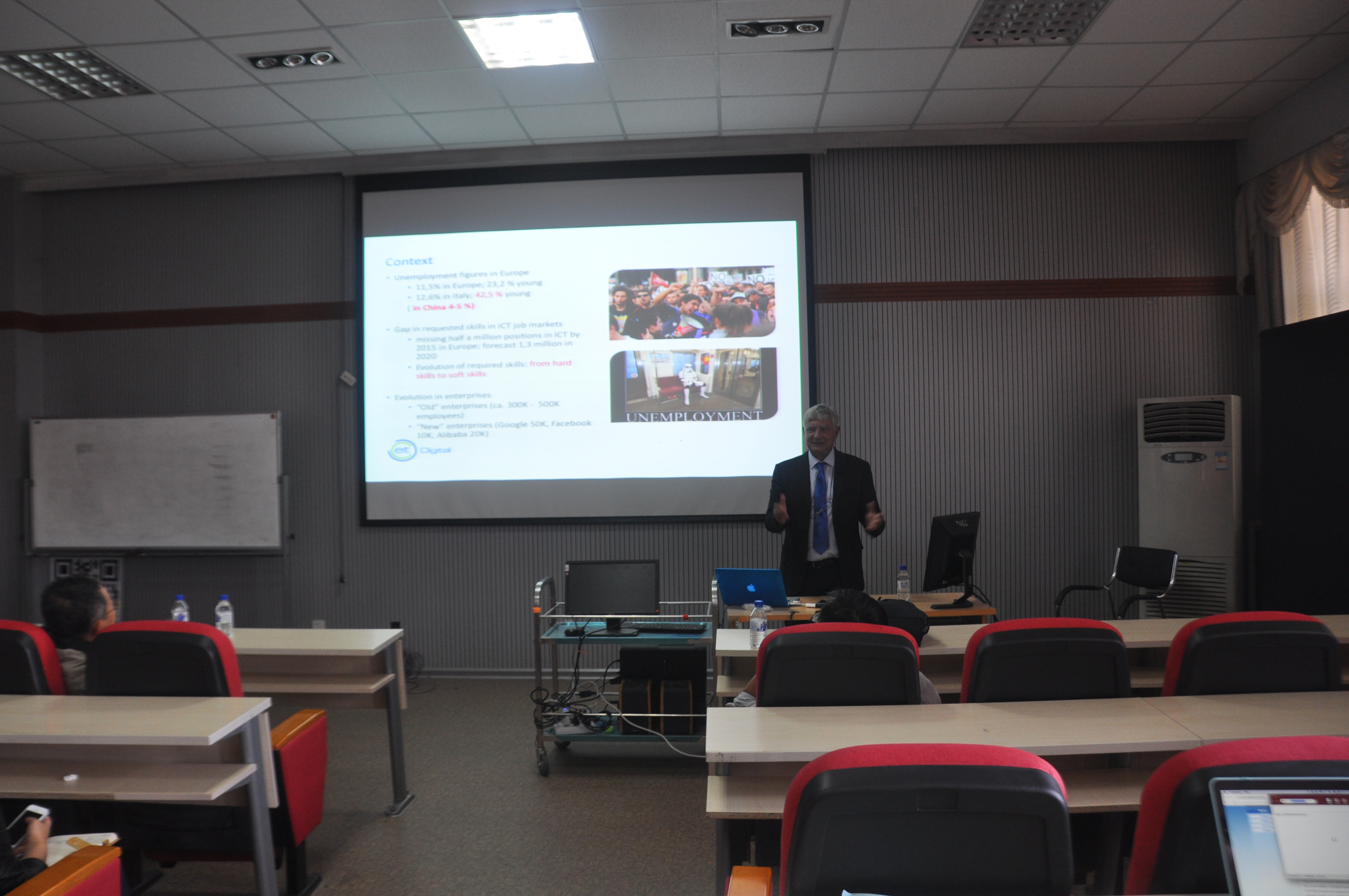 的青年教师和研究生做了题为“Blending entrepreneurial education into engineering graduate programs”和“Active Aging”的学术报告。Marchese教授首先介绍了特伦托大学的研究生创新创业教育体系。针对研究生如何将所从事科学研究与企业需求相结合,博士研究生创业的有效途径等问题,进行了深入剖析。对于人口老龄化问题,Marchese教授分析了亚洲和欧洲的老龄化问题的共同点及不同点。针对该领域的当前热点研究方向进行了深入的分析,并对应用计算机技术辅助提高老年人生活质量的未来发展方向进行了预测。整个讲座得到了青年教师和研究生的积极响应。主讲结束后,Marchese教授回答了老师和同学们提出的相关问题。