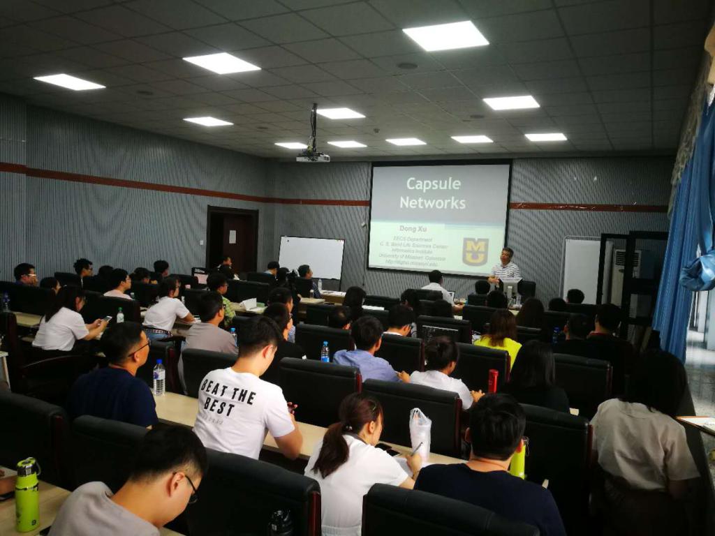 许东教授首先详细介绍了深度学习的发展历史,并指出了深度学习在现阶段的发展瓶颈,由此引出了一种最新的深度学习模型:胶囊网络。进而他通过对传统方法进行人脸识别时遇到的问题作为切入点对胶囊网络进行了深入讲解,分别从胶囊网络的模型、算法以及所适用的情景等方面进行深入细致的阐述,最后分享了他所领导的课题组在生物信息学领域中对于胶囊网络的应用情况。许东教授的报告深入浅出,娓娓道来。在报告的最后阶段,听众与许东教授进行了热烈的讨论,许老师对大家的提问进行了细致和耐心的讲解。整个报告会一共持续了四个小时,近20位听众是在站立中听完了这四个小时的报告,这也说明了报告的精彩程度。
