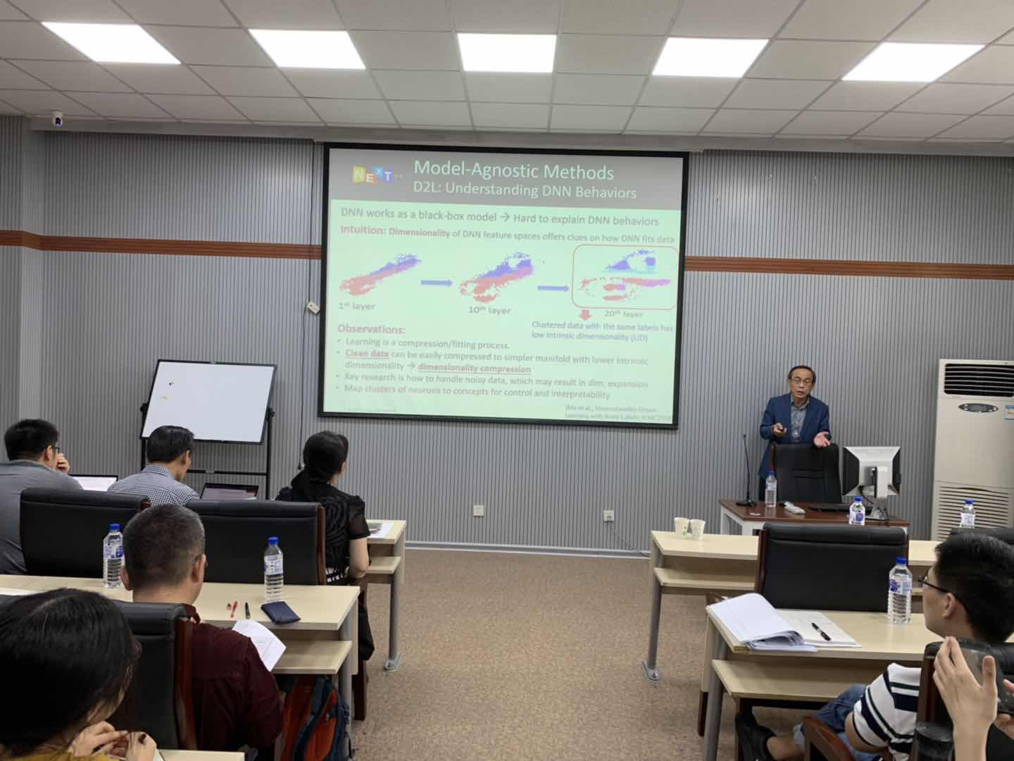 在本次报告中,蔡教授从人工智能的历史与深度学习的发展入手,由浅入深的为在场同学和老师详细讲解了视频关系推理的研究现状以及利用的先进方法的领域知识。通过信息理论的原理和对抗算法来实现可解释的人工智能。此外,报告还给出了蔡教授所带领的课题组在视觉对话等领域取得的成果,通过具体的示例,使得大家对深度学习在具体领域的应用有了更层次的理解。最后,蔡教授介绍了最近在视频分析领域的一些工作和几个有趣的研究方向。讲座结束后,蔡教授针对师生提出的一些学术领域的问题,一一进行了细致详尽的回答。整场报告,蔡教授演讲风格风趣幽默,言简意赅,给全体师生带了很多非常富有创造性的启发,为大家呈现了一场精彩绝伦的学术盛宴。本次报告受到了广大师生的热烈响应。