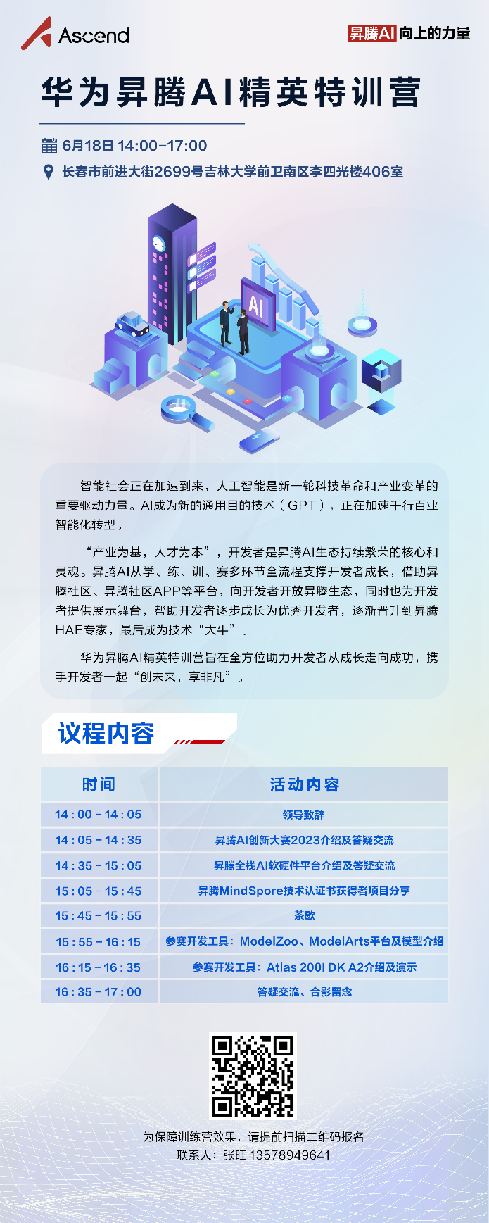 为让六合彩开奖结果 师生提升自主创新能力,快速了解华为昇腾AI平台,吉林大学华为信息与网络技术六合彩开奖结果 联合华为公司举办吉林大学华为昇腾AI精英特训营。时间:2023年6月18日14:00-17:00,地点:中心校区李四光楼406室。欢迎感兴趣的师生扫码注册(茶歇要确定餐点份数)和按时参加。