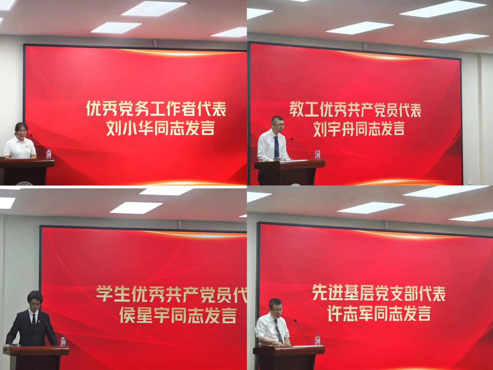 优秀党员代表刘宇舟、侯星宇优秀党务工作者代表刘小华、先进基层党支部代表许志军分别上台发言,分享了他们他们所在集体永葆初心使命、坚守责任担当,发扬党的优良作风和光荣传统,发挥基层党支部战斗堡垒作用和共产党员先锋模范作用的先进事迹和宝贵经验。