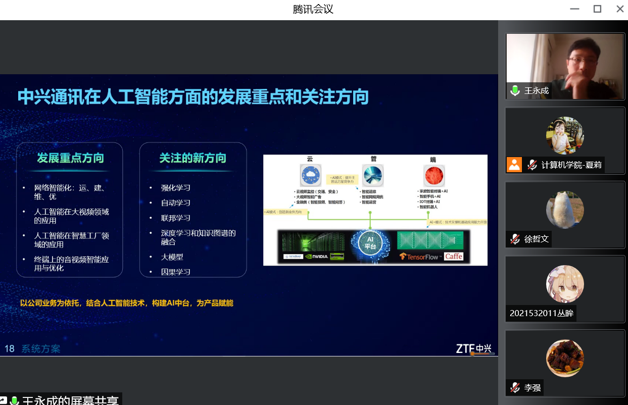 本次报告中王部长主要围绕AI技术过去十年的发展历程、AI技术未来发展趋势和方向研判以及中兴通讯在人工智能方面的关注重点和主要应用情况三方面主题进行介绍。首先,王部长展示了2022 Gartner 新技术成熟曲线,并得出结论人工智能的炒作周期充满创新。通过AI发展历史来看,现阶段正处于一个技术周期的末段。人工智能的四大趋势依次为渗透、深入、闭环和安全可信。接下来,王部长介绍了监督学习、强化学习、自动学习、白监督学习和因果学习五种未来人工智能学习方式的发展方向并一一进行展开说明。王部长还介绍了中兴通讯在人工智能方面的发展重要方向为:网络智能化的运、健、维、优;人工智能在大视频领域和在指挥工厂领域的应用;终端上的音视频智能应用与优化。中兴通讯目前关注的新方向为强化学习、自主学习、联邦学习、深度学习和知识图谱的融合、大模型和因果学习。最后,王部长简要介绍了现阶段中兴通讯部分重点研发项目。