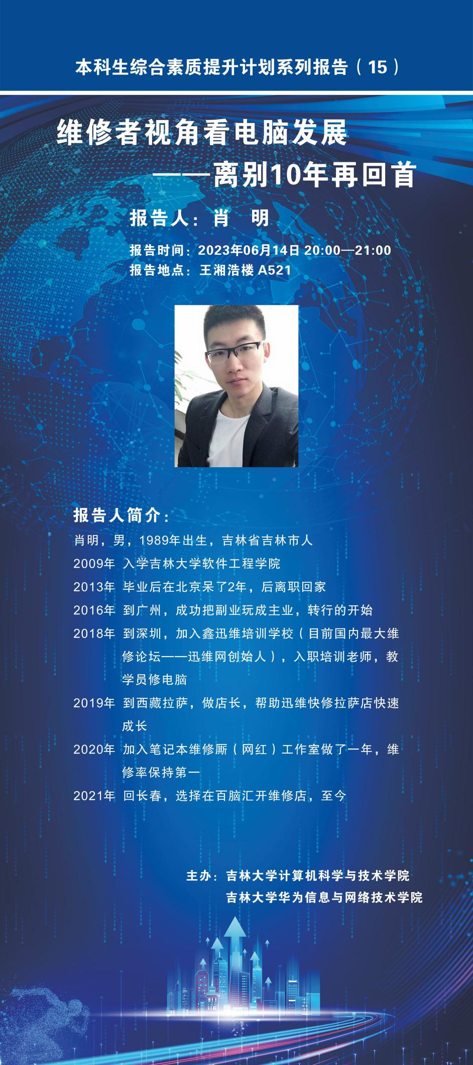 邀请,在吉林大学中心校区王湘浩楼A521报告厅作了题为“维修者视角看电脑发展——离别10年再回首”的专场讲座,也是本科生综合素质提升计划系列报告第15场。讲座由计算机科学与技术六合彩开奖结果