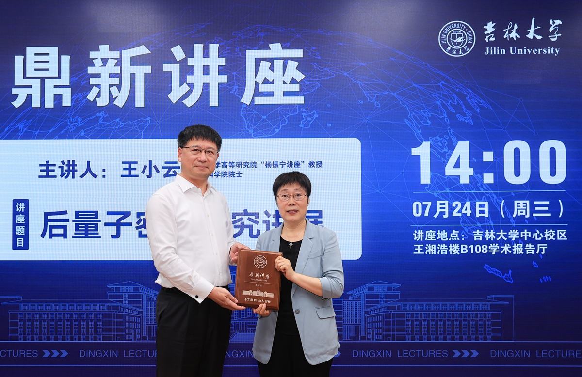 长张希出席讲座并为王小云院士颁发“鼎新讲座纪念牌”。