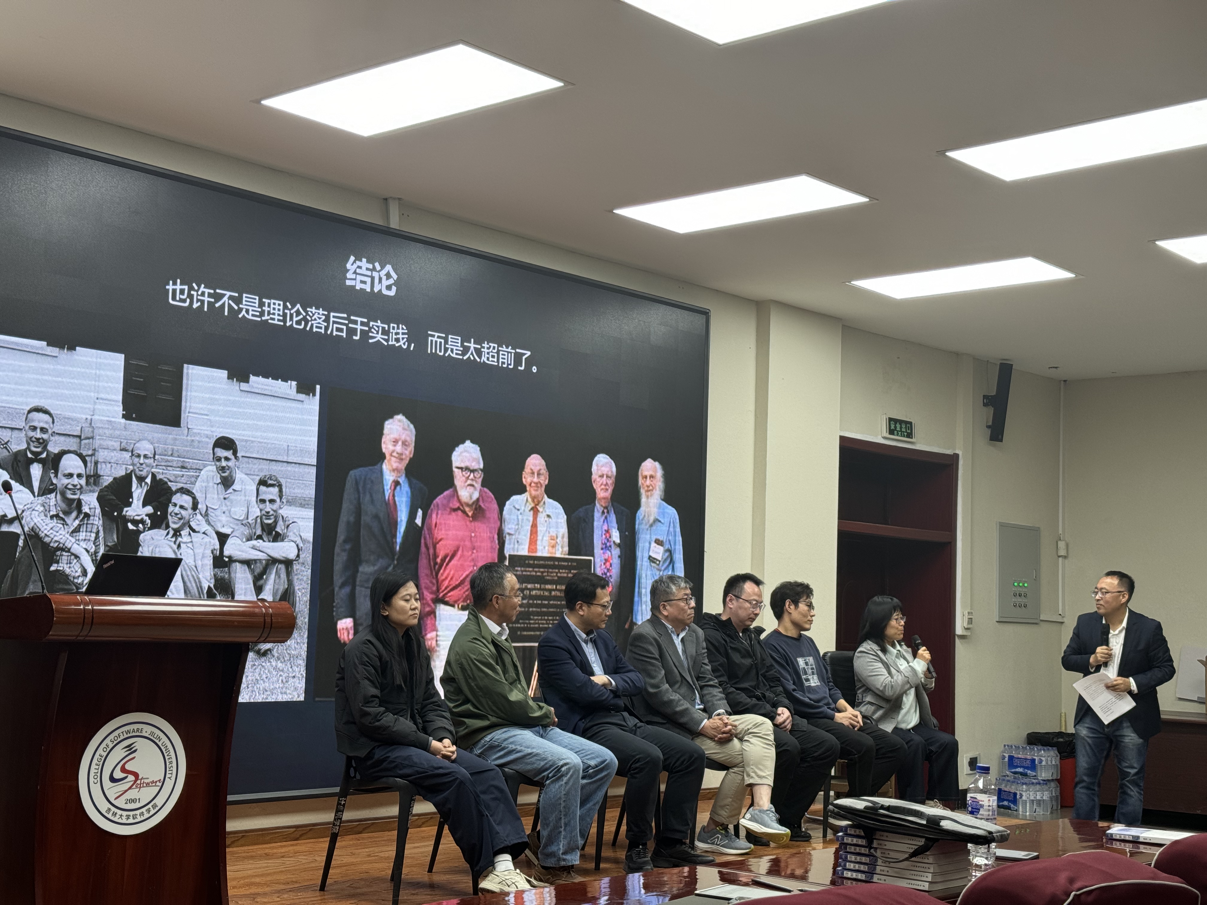 院长、王湘浩人工智能虚拟教研室主任杨博教授进行了总结发言。世界人工智能的起点可追溯到1956年的达特茅斯会议,中国人工智能的起点是1977年的吉林大学,王湘浩院士在吉林大学最早倡导开展人工智能研究,希望大家发扬继承王湘浩院士的三个精神,第一个精神是爱国精神,1949年从普林斯顿大学博士毕业后回到祖国参与国家建设。第二个精神是北上精神,1952年高校院系调整,他从北京来到了冰天雪地的长春。第三是敢为人先的精神。王湘浩在普林斯顿攻读博士学位时,敢于对已得到代数界公认的格伦瓦尔德定理进行质疑,发现其错误并举出反例,继续对格伦瓦尔德定理进行修正并做推广。1958年他这个放弃了非常熟悉的代数领域,转到控制论,即后来的计算机科学研究。希望各位同学继承和发扬王湘浩院士精神,在人工智能的浪潮下刻苦学习、学有所成。