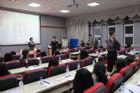 王同学做脸部模特,进行现场实例教学。此外,针对于职业装的穿着搭配知识和不同体型人适合的款式问题,王老师也进行了详细的说明。活动结束后,同学们纷纷上前交流咨询,王老师对所有问题都给予了耐心的解答并针对每个人的肤质向同学们赠送了精美礼品。