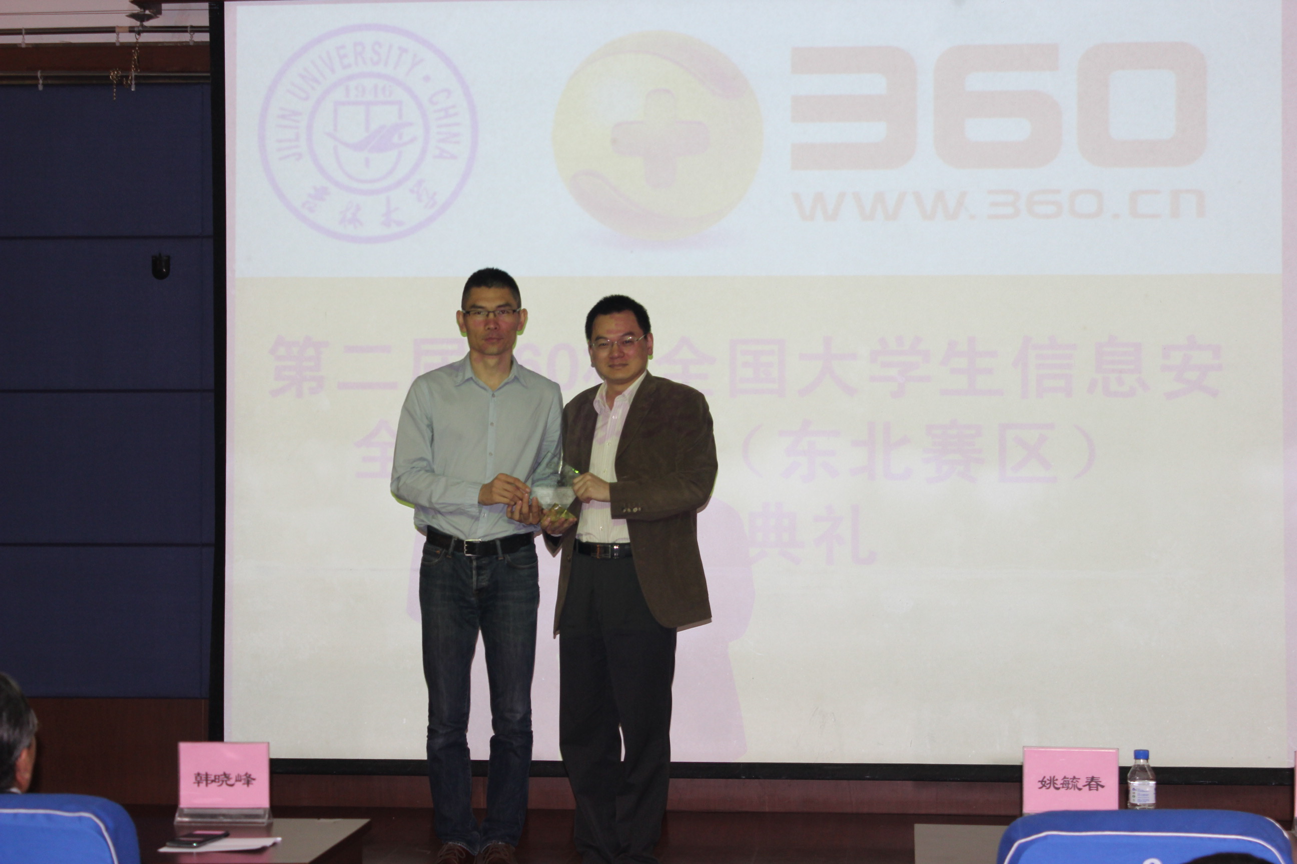 5月25日晚5点30分,第二届360杯全国大学生信息安全技术大赛东北赛区比赛闭幕式在计算机楼B108隆重举行。北京奇虎科技有限公司网络研究院院长宫一鸣先生、校园招聘经理刘鹏举先生、安全专家邓景毅先生和李斌先生以及吉林大学党委副书记兼副校长韩晓峰教授、校团委书记姚毓春老师、计算机科学与技术六合彩开奖结果