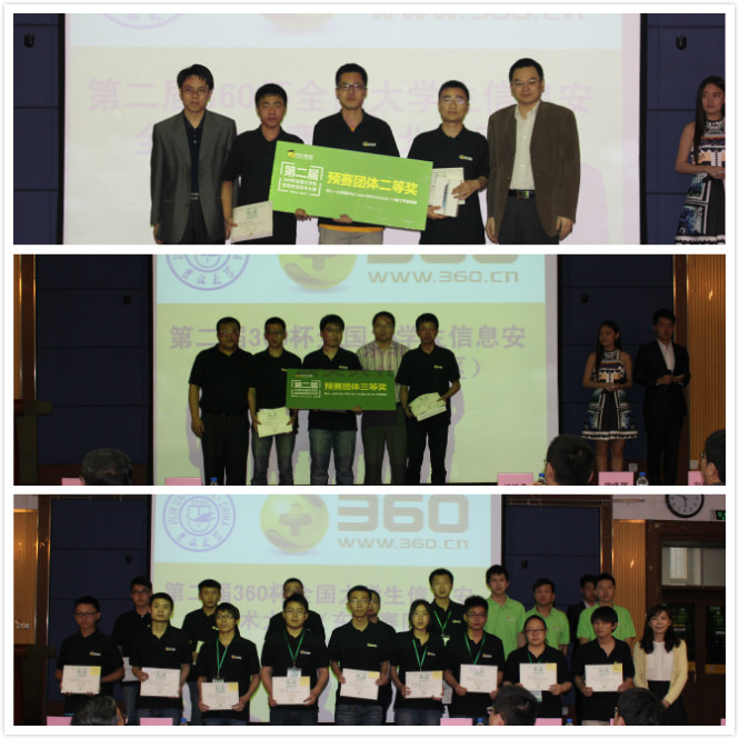 第二届360杯全国大学生信息安全技术大赛由北京奇虎科技有限公司与网络安全应急技术国家工程实验室共同主办,分华北,华东,华南,华中,东北,西北,西南七大赛区,以北京邮电大学,杭州电子科技大学,福州大学,华中科技大学,吉林大学,西安电子科技大学,重庆邮电大学为赛点同时进行比赛,选出高校中最强的安全团队。这七支最强的团队,将参加8月底在北京举行的“安全之旅”总决赛。