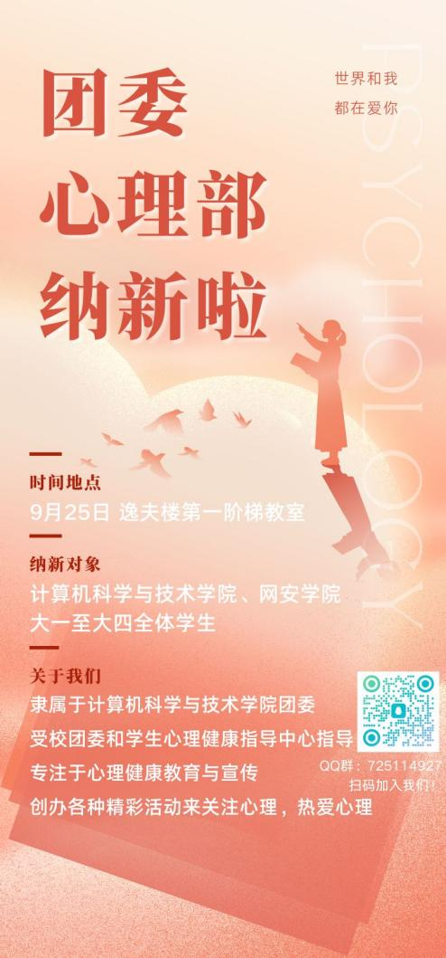 世界上最宽阔的是海洋,比海洋更宽阔的是心灵。加入我们,让我们一起用贴心的言语和可爱的笑容,传递爱与温暖,点亮彼此心灵的天空,在团委心理部这个有爱的大家庭里一起发光发热。