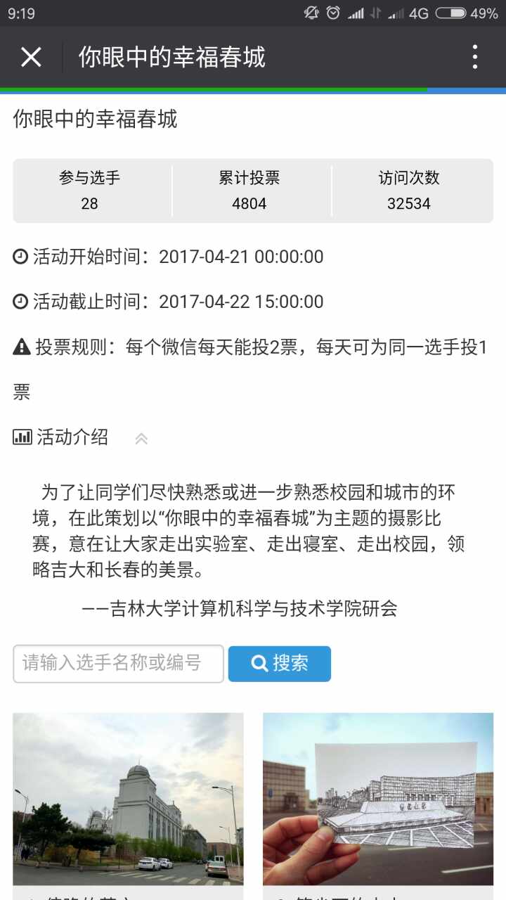 4月15日至4月20日期间,广大同学以微信报名和邮箱报名的方式踊跃地参与到此次活动中来,将自己最满意的春城拍摄作品提交上来。为期6天的作品征集结束以后,经过精心的筛选,28张唯美悦目,如诗如画的主题摄影脱颖而出,进入参与投票环节。外联部和宣传部也随即开始了紧锣密鼓地投票准备工作。经过为期两天的微信平台投票过程,各个参赛选手激烈角逐,最终六个人气作品脱颖而出,此次投票平台累计获得投票数4804票以及32534次数的访问量。
