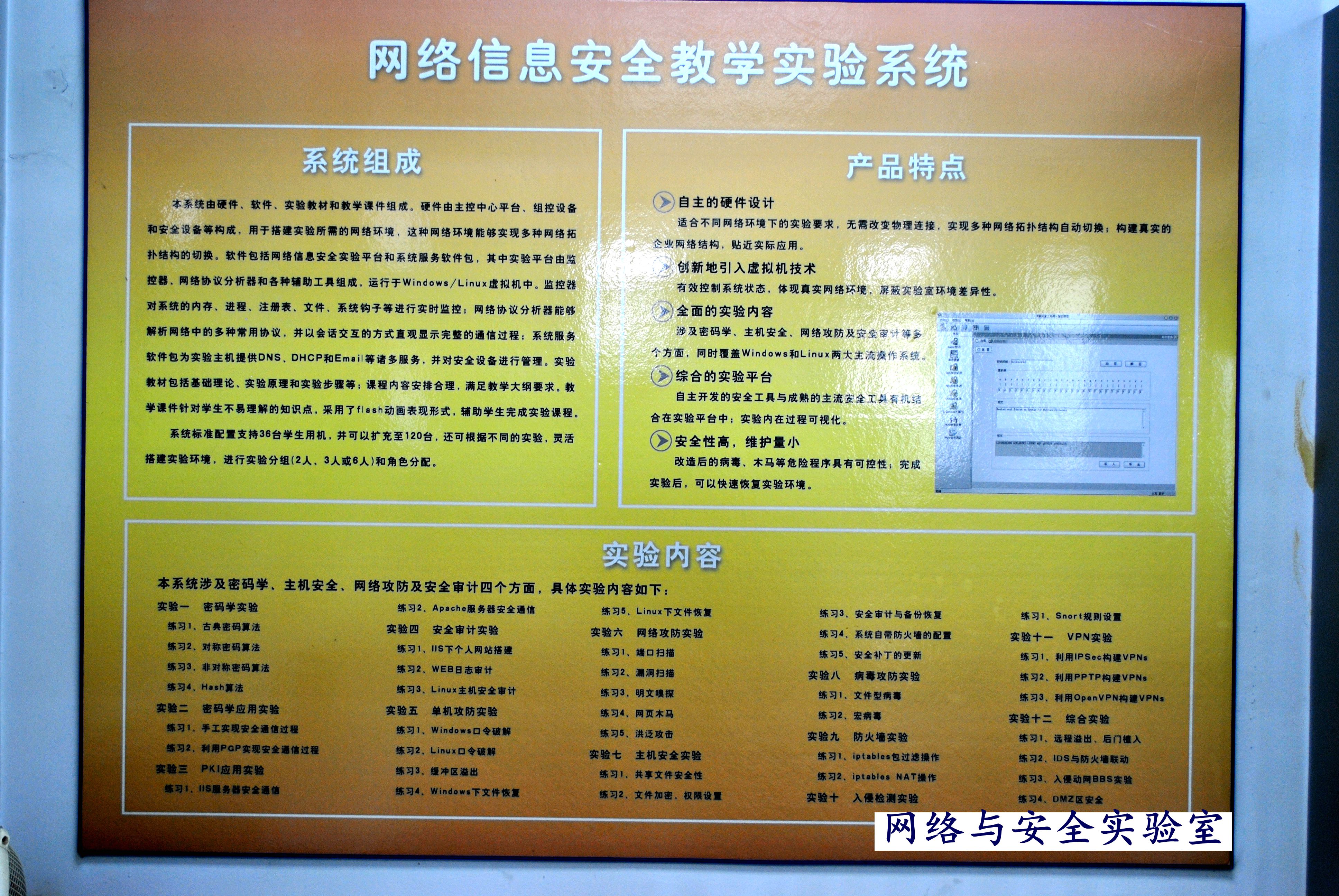 网络与安全实验室由A227 、A230、B312三个实验房间组成,总面积562平方米,可同时容纳二百二十名学生上机做实验,实验室有各项完善的规章管理制度,有专职实验人员五人,其中高工三人,工程师两人。A227、A230为网络协议分析与故障诊断实验室,是基于吉林大学与吉大中软公司合作研发“网络协议仿真教学系统”平台上进行的实验课。该实验独立设置、单独计入1.5学分,共计32 学分、36个实验项目。实验项目由必修课14项和选修课22项组成,其中必修课设置为计划内的实验学时,选修课设置为计划外的实验学时,验证型、设计型和综合型实验类型各占比例分别为22%、22%和56%。B312为网络与信息安全实验室,主要是面向信息安全专业的本科生开展实验课,一部分课时面向物联网工程专业和软件工程专业的本科生。网络与信息安全实验教学平台,主要由主控中心平台、安全设备、组控设备、无线组控设备、应用服务器和管理服务器组成。根据不同层次的教学需要,可搭建成实验教学所需的网络环境,可以灵活实现多种网络拓扑结构,详见(实验平台结构框图)。